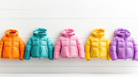 This image showcases a collection of vibrant puffer jackets arranged neatly against a white background, highlighting colorful winter fashion choices.
