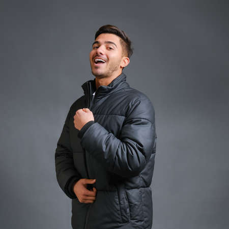 Smiling stylish guy model on a gray background is warmly dressed in a black down jacket. High quality photo
