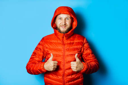Man in a red jacket with a hood makes a gesture with his hands on a blue background. Concept of winter, autumn, cold.