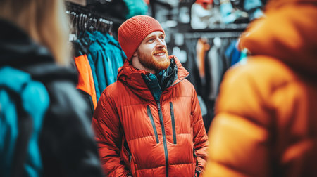 Happy Customer Receiving Expert Advice from Salesman on Outdoor Clothing in a Retail Store