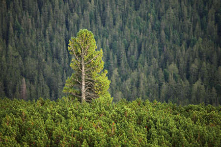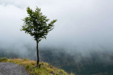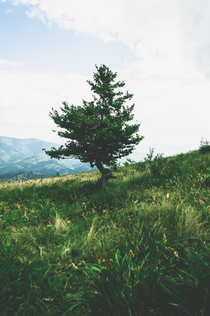 Wind sculpted tree on hillside, symbolizing wild, untamed nature in untouched landscapes