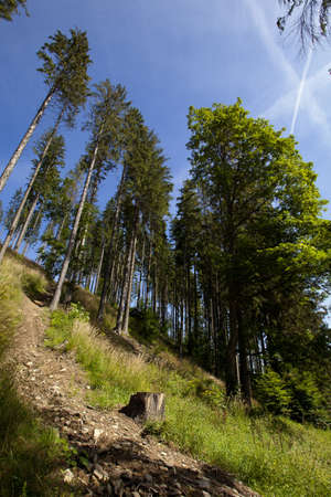 beautiful green pine forest in the Carpathians front lawn with cut down trees on a sunny day, front view the average plan