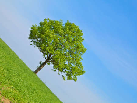 Close-up growing deciduous tree on small slope mountain, hill overgrown with green grass, flowers and various lush vegetation.
