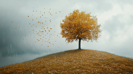 Lone tree on a hill with golden leaves, water drops falling gently in a serene autumn landscape, generative ai