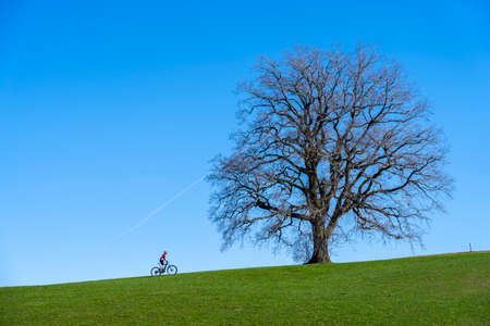senior woman mountainbiking on a e-mountainbike in early spring below a huge old tree with snow covered Mount Hochgrat in background, in the Allgaeu Area, a part of the bavarian alps, Germany