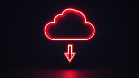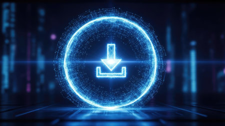An illuminated download symbol dominates the scene, rendered in a bright neon style. The circular design is set against a dark, abstract background with glowing particles. This image conveys the concept of digital access, information transfer, and network communication, suitable for various editorial and commercial applications.