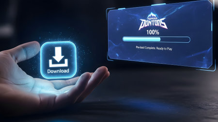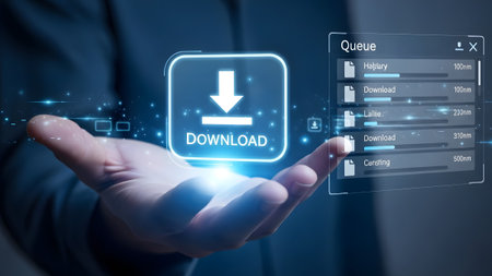 Hand holds glowing download icon and a holographic queue list with download progress. Clear detai...