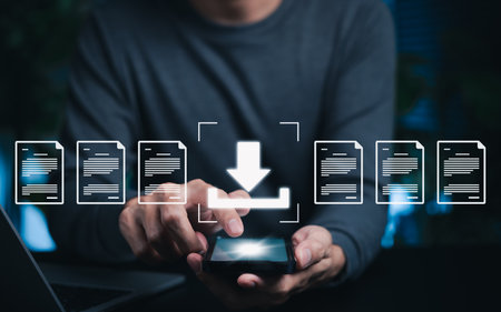 Digital File Download and Data Transfer Technology Concept. Man using smartphone to download document files symbolizing file access, software, cloud storage, file management, data transfer technology,