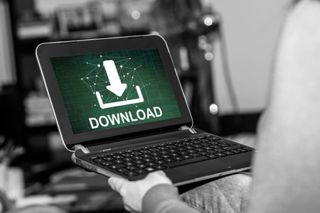 Man using laptop with download icon on screen. Internet and technology concept.