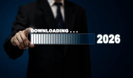 Businessman in suit pointing at a digital progress bar with the word “Downloading…†and the number 2026 illuminated. The image symbolizes preparation for the new year, upcoming goals, future plans, business strategy, innovation, and digital transformation. Perfect for new year campaigns, tech presentations, future trends, and startup planning visuals.