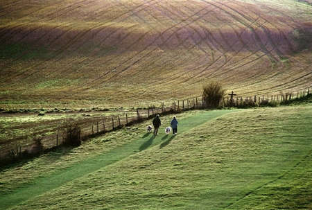 walkers with dogs. the ridgeway path. pitstone hill.