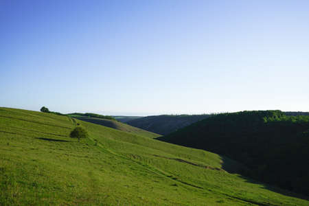 Summer landscape with hilly green field and forest in the distance
