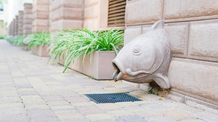 Rain water is pouring from the green draining gutter on the pavement, selective focus, Nida, Lithuania