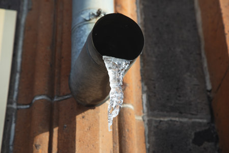 Frozen water in a downspout creates drainage problems