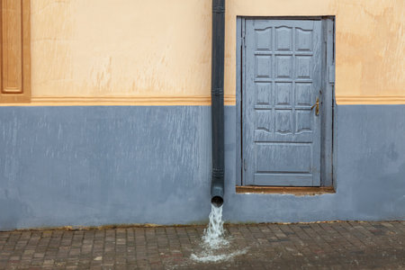 The wall of an old house with a door and a drainpipe from which water flows.