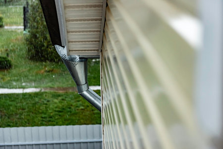 Rain drops falling down from a rain gutter on a rainy day