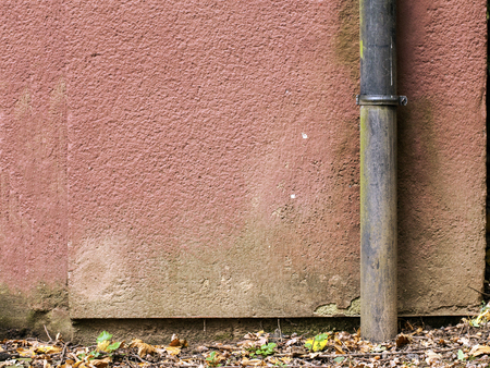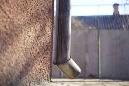 Old drain pipe at the corner of the rural house.