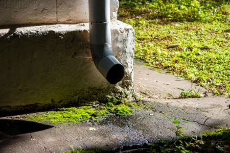 Bottom of the drain pipe at the corner of the house. Autumn day with pleasant sunlight on the background of the garden