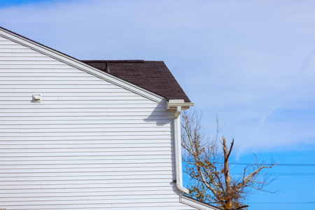 Roofing steel gutter rain system on building corner on light copy space background. Roofing, construction, drainage pipes installation concept.