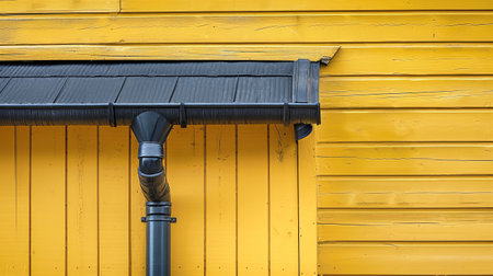 A black gutter contrasts against a bright yellow house, serving as a drainpipe to collect and drain rainwater from the wooden structure.
