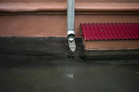 Rain pipe on the wall of the house Rain water flowing from drain pipe closeup