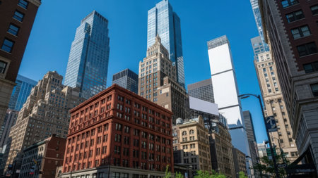 Vibrant urban scene featuring a mix of historic and modern architecture against a beautiful blue sky, illustrating the dynamic character of city life and landscape.