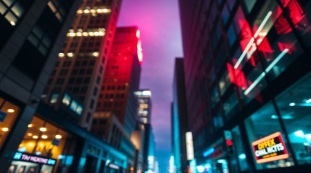 Blurred neon signs cast a vibrant glow on city buildings at dusk, creating a captivating urban nightscape. Ai generated image