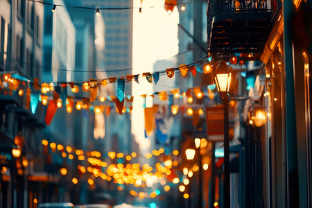 Festive street with colorful lights and bunting in urban setting at dusk, Mardi Gras.
