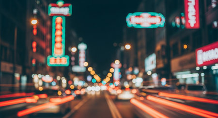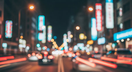A blurry cityscape with a lot of lights and cars. The city appears to be in motion, with the lights and cars streaking past each other. Scene is energetic and dynamic, with the city's hustle