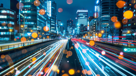 Captivating night cityscape showcasing illuminated highways and skyscrapers. The vibrant light trails create dynamic energy and movement.