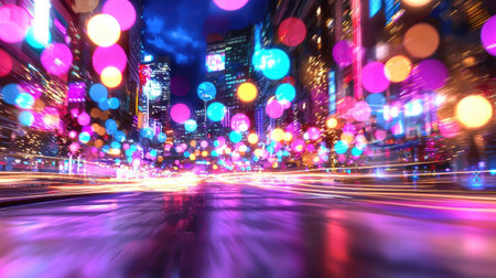 A blurred city street at night is illuminated by a vibrant display of colorful bokeh lights from festive holiday...