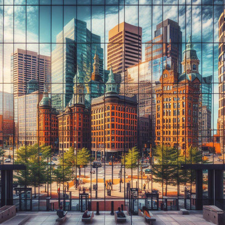 Boston, Massachusetts, USA. City skyline reflected in glass wall.