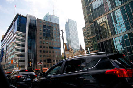 Toronto, Canada - May 6, 2023: vivid street scene in heart of Toronto captures essence of urban Canada: taxis, diverse commuters, cosmopolitan city framed by towering downtown skyscrapers.