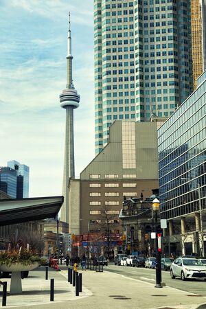 TORONTO-CANADA, 10 APRIL 2017: CN tower, third tallest tower in the world and the tallest free-standing structure in the Western Hemisphere, a signature icon of Toronto's skyline, and a symbol of Canada