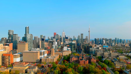 Toronto city skyline shows the cn tower and the university of toronto campus with its green spaces and surrounding buildings under a clear blue sky. Urban style concept Canada