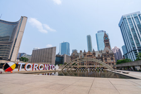 Toronto, Ontario, Canada - July 19 2021 : Fountain at Nathan Phillips Square. Toronto Sign.