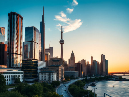 Captivating city skyline during sunset showcases a blend of modern architecture and nature. Warm tones fill the sky, creating a stunning urban landscape.