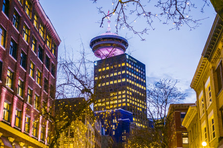 Stunning twilight cityscape of downtown vancouver, featuring modern skyscrapers and boats