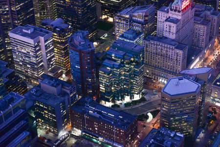 Vancouver city financial district at night, photo taken from the Harbour Centre tower, Vancouver, British Columbia, Canada.