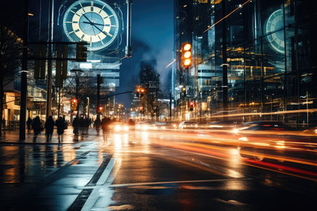 An unfocused image of an urban road at nighttime, filled with moving cars and a clock-bearing structure on the intersection.by Generative AI.