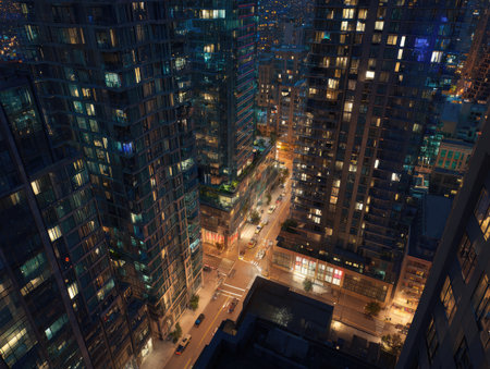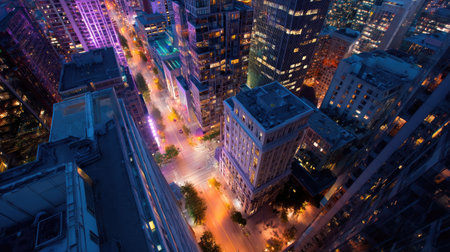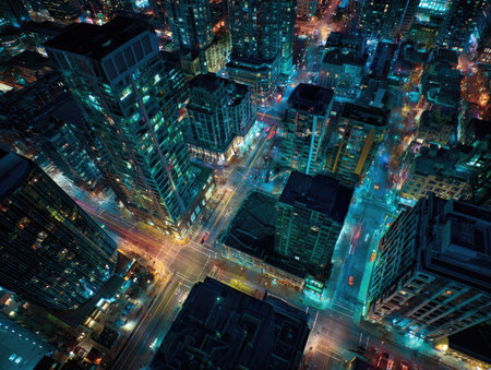 An overhead view reveals a dense cityscape lit up at night. The image showcases numerous high-rise buildings, their windows glowing. Streets below are illuminated, suggesting activity and transportation. The scene may be used for editorial, commercial, or illustrative purposes.