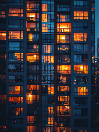 A vibrant city skyline at dusk, showcasing glowing skyscrapers against a deep blue sky, reflecting urban life.