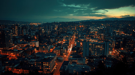 Beautiful view of the modern cityscape from an aerial perspective at night. Taken in Downtown Vancouver, BC, Canada.