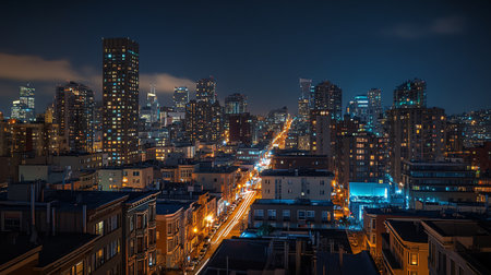 A captivating nighttime cityscape featuring illuminated buildings, roads, and a cloudy sky. The lights create a vibrant and dynamic atmosphere.