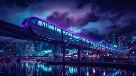A vibrant monorail illuminates the night infused with cosmic energy. City skyscrapers reflect the enchanting scene as New Year celebrations unfold.