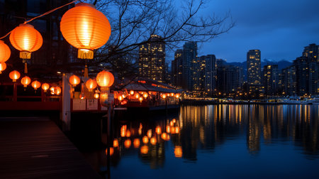 Lanterns illuminate waterfront restaurants in Vancouver on a tranquil evening