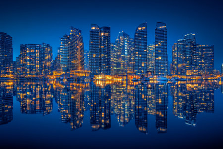 Majestic skyscrapers illuminate the night sky, their reflections dancing on calm waters