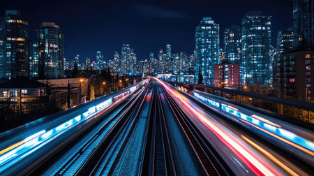A high-speed train at night, illuminated by station lights as it stops for passengers, with the dark city skyline in the background, creating a dynamic and vibrant scene.