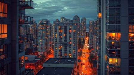 Stunning cityscape showcasing sleek glass skyscrapers illuminated by warm evening lights. The juxtaposition of architecture and nature creates an intriguing urban vista.