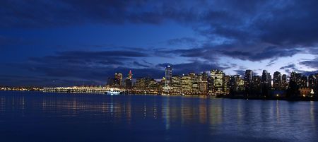 The skyline of Vancouver, British Columbia, Canada, with reflections on the water against a dramatic blue sky at night